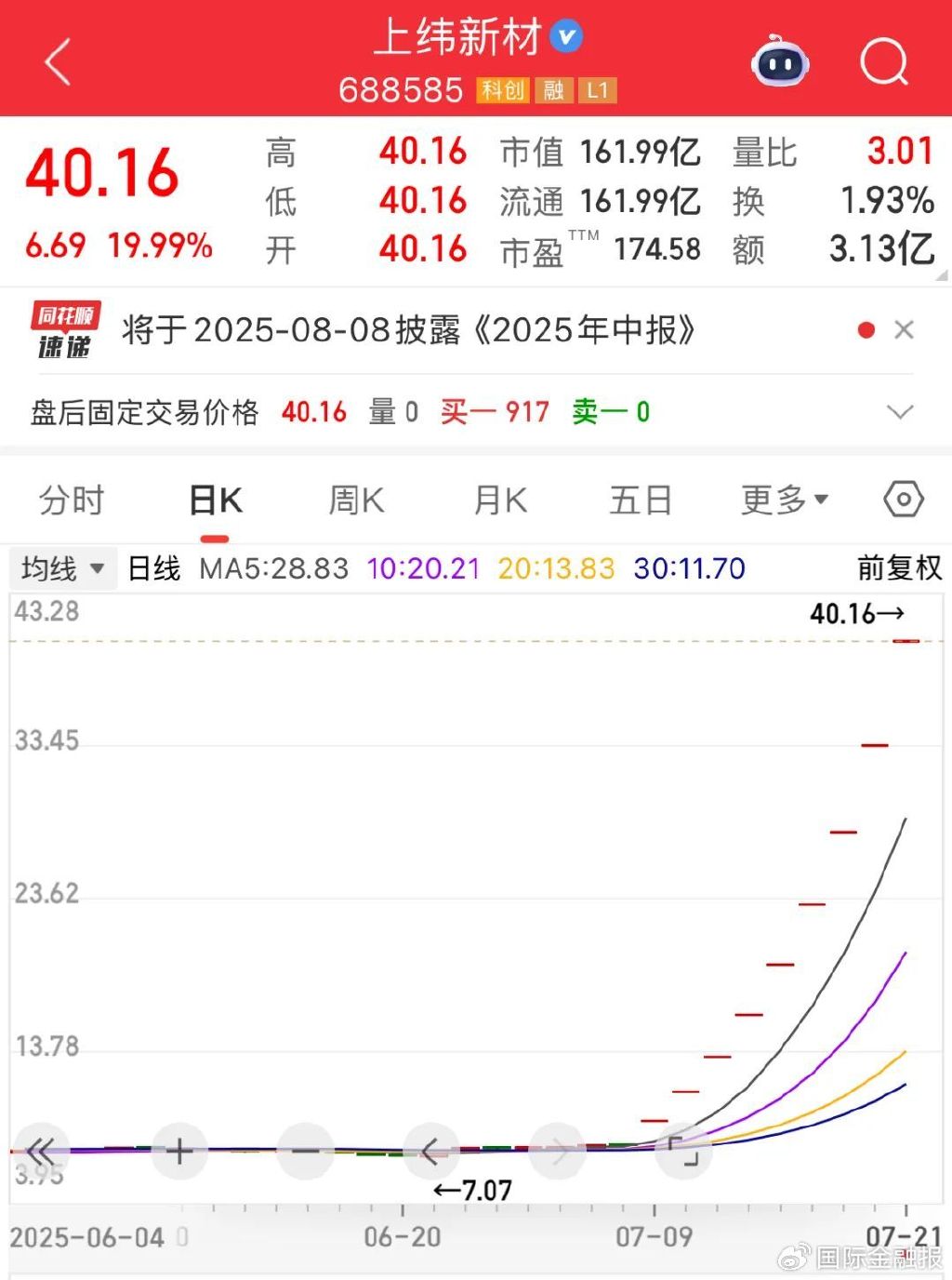 作为科创板上市公司,上纬新材每日涨跌幅限制为20%。上述消息一经公布,市场瞬间沸腾。7月9日复牌首日,上纬新材一开盘就被巨量买单封死在20%的涨停板。此后,其股价如火箭般蹿升,连续9个交易日上演 “20CM” 一字涨停,一举创下A股 “20CM” 一字连板的纪录,股价从7.78元飙升至40.16元,累计涨幅高达超过400%。截至7月21日收盘,上纬新材最新市值达到162亿元,成交额为3.13亿元,换手率达1.93%。